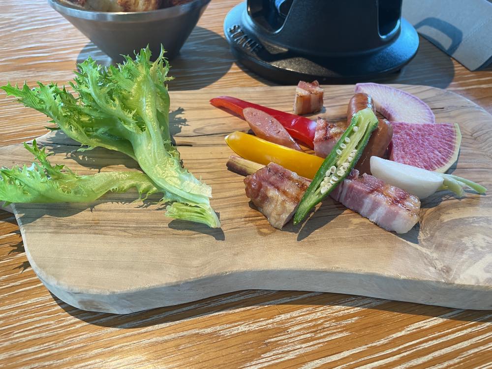 フォンデュポットに溶けたチーズと、具材はバゲットに野菜やベーコン・ウィンナーなどのシャルキュトリー。