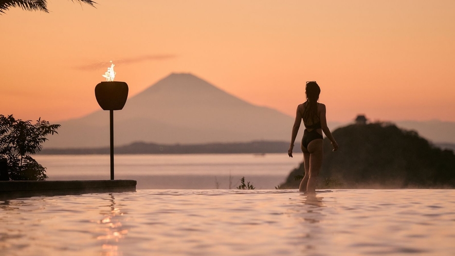 高台にある施設のため海から直線距離で1km以上は離れているにも関わらず、まるで海に続くかのような開放感が味わえるインフィニティプール「BLACK POOL」を実現し、天気の良い日には目の前に富士山も望める特等席。