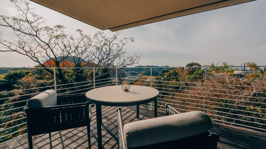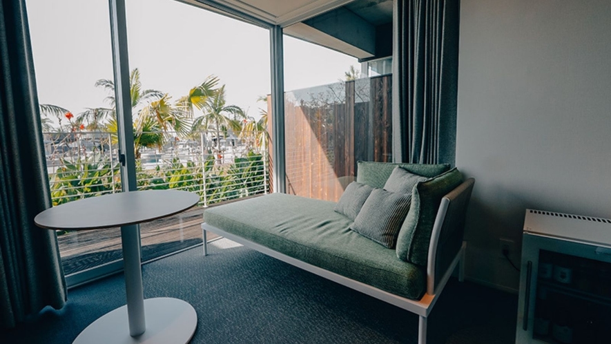 屋外で過ごすのに気持ちが良い季節には特におすすめの部屋で、広いテラスに置かれたビーチチェアでのびのびと夕日を眺めたり星空の下で寛いだりすることができます。