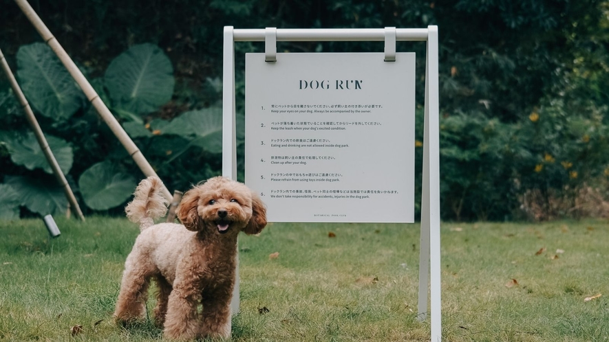 施設内には共有のドッグランも設けてあってリードフリーで自由に遊ばせてあげられる他、ボタニカルな植栽あふれる敷地内をお散歩したり、プールサイドで一緒にくつろいだりと、愛犬と一緒に非日常を体験できますよ。