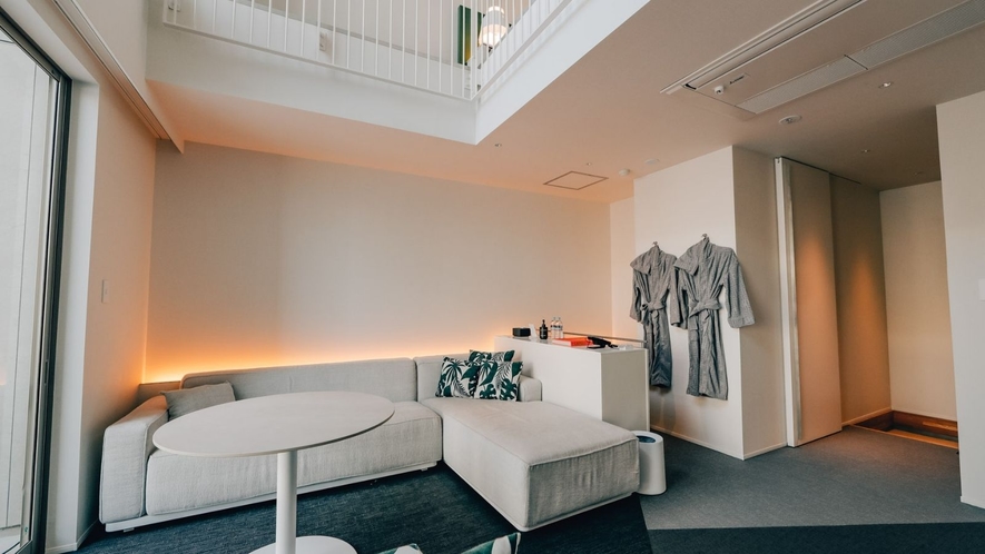 吹き抜けのリビングが開放的なメゾネットタイプのPOOL VILLA(プールヴィラ)。