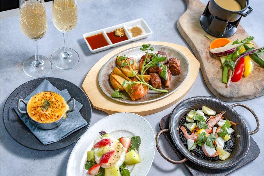 季節の野菜や千葉県産ベーコン・ソーセージを添えた温かいフォンデュプレートは、とろけるチーズの濃厚な香りを楽しむ「チーズフォンデュ」と、トマトの酸味とクリームのまろやかさが調和した「トマトクリームフォンデュ」から選択可能。