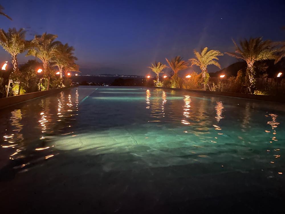 ライトアップされたインフィニティープール・「BLACK POOL」のまわりにはかがり火が焚かれ、海外のリゾートアイランドに迷い込んだよう。