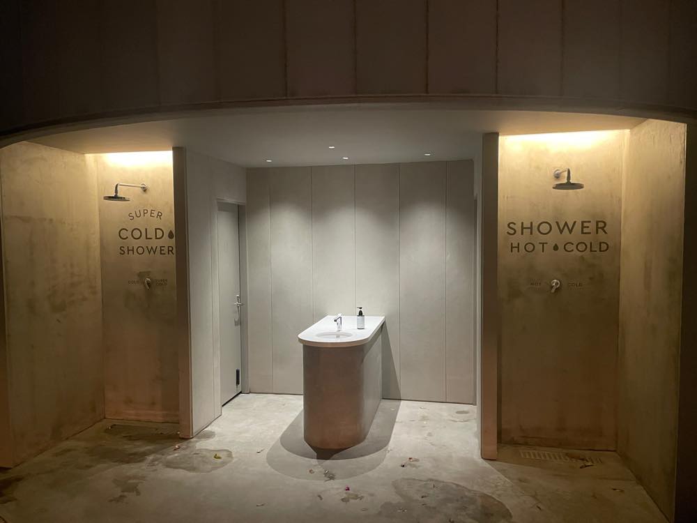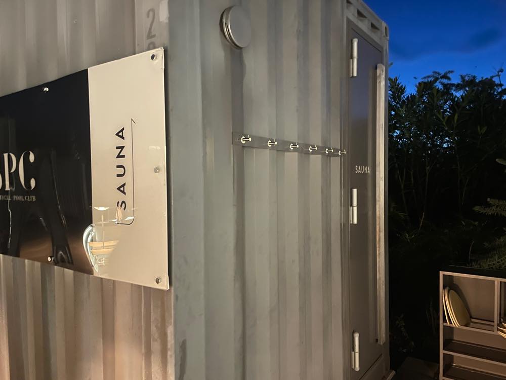 また、コンテナスタイルのサウナルームもプールサイドに設置してあり、温水・冷水のシャワーブースやととのいスペースも設けてありました。