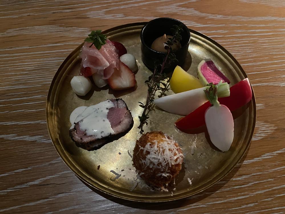 この日は鴨肉・バーニャカウダ・イチゴとモッツァレラ&生ハムのカプレーゼ・ミニメンチカツの4品で、特にイチゴのカプレーゼは初めての体験だったのですが、イチゴの香りと爽やかな酸味が生ハムの塩味、そしてモッツァレラのクリーミーな味わいがとても美味しかったです。