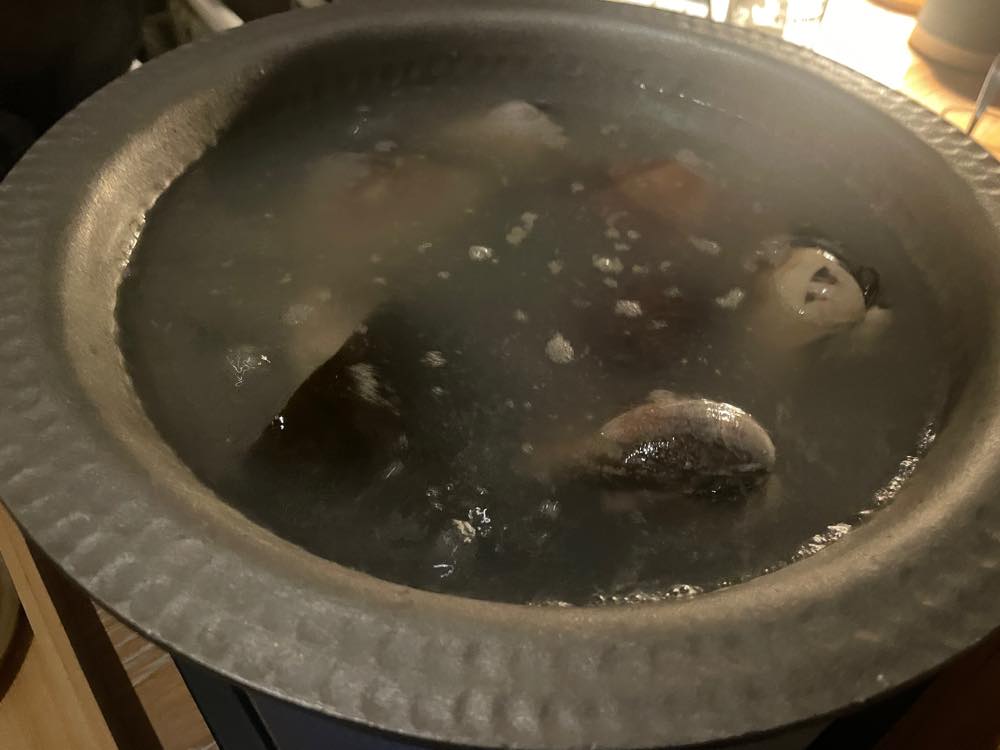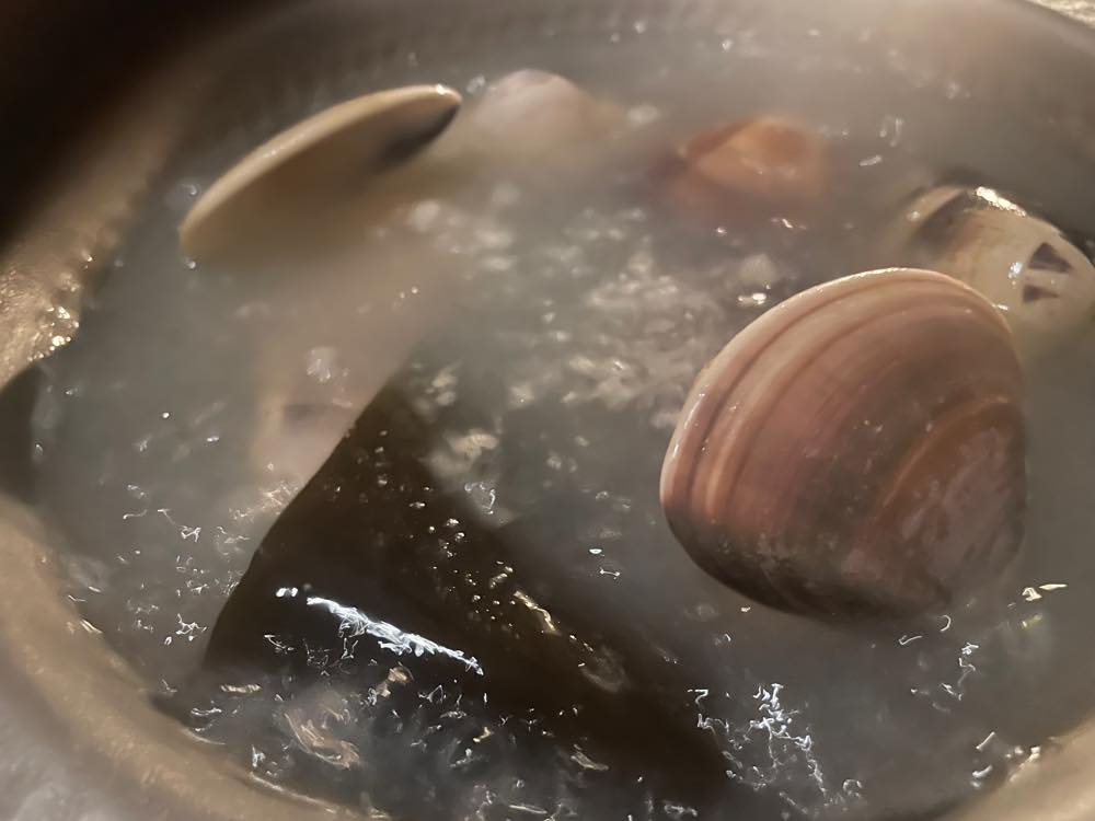 作り方の手順に従い、まずは出汁にハマグリを入れて殻が開くまで加熱。
