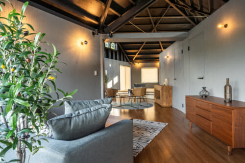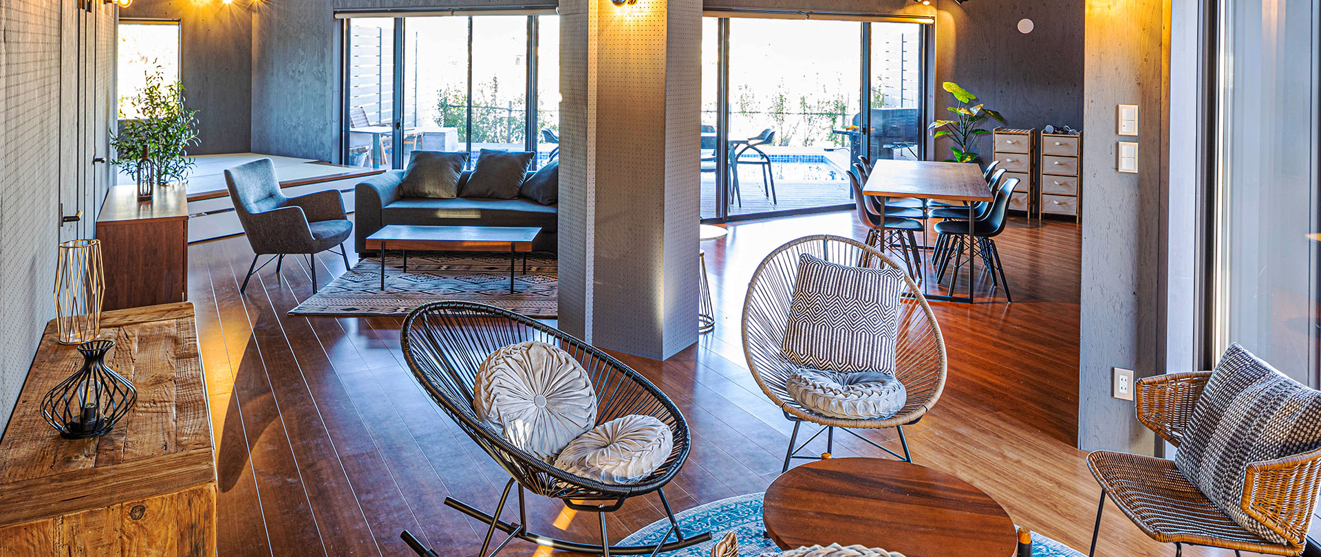 屋根の勾配を生かした天井の造りになっているため開放感があり、プールに面した側は大きなテラス窓からの自然光が気持ちよく差し込んでいます。