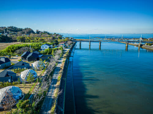 中でもグランドーム千葉富津があるのは、東京湾に流れ込む湊川の河口に面した開放的で比較的静かなエリア。