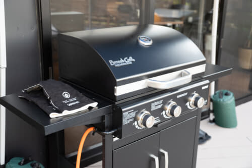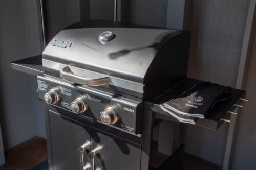 食事スペースに備えてあるBBQガスグリルは、炭火と違って火おこしの手間がなく、火力調整も自由自在。