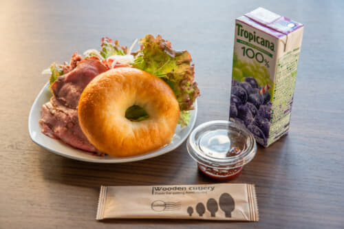 朝食メニューはローストビーフのベーグルサンド。