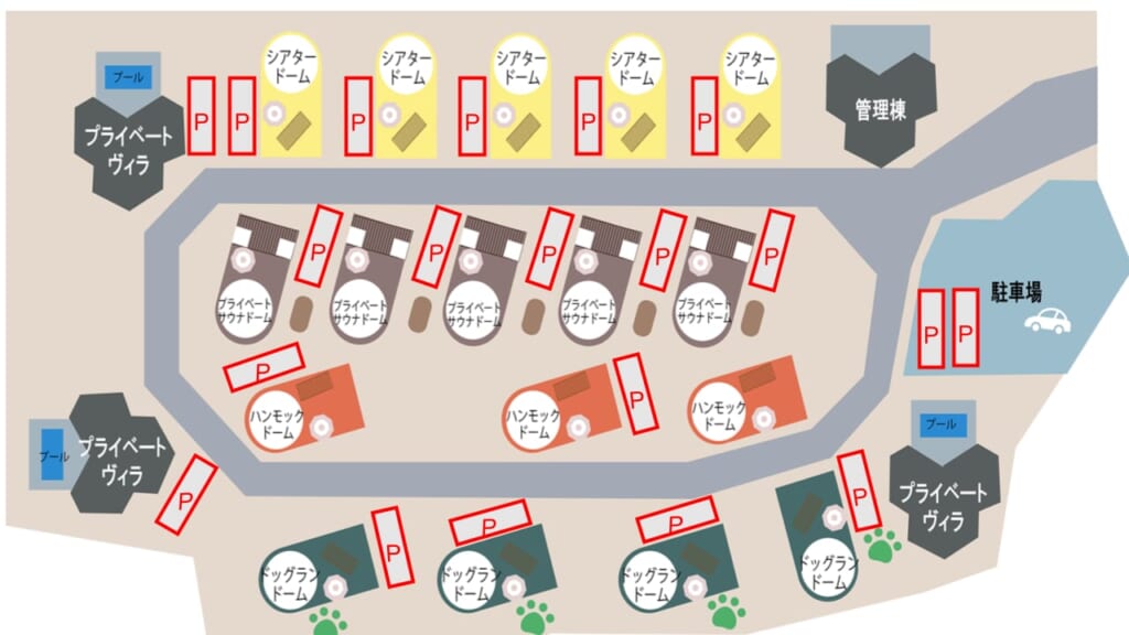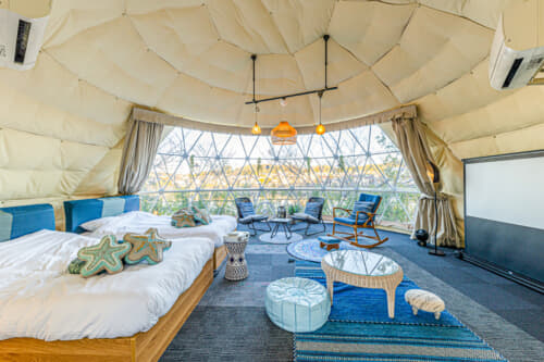↑のマップでもわかるように、グランドーム千葉富津には4タイプのドームテント17棟と、プライベートヴィラ3棟が配置してあります。