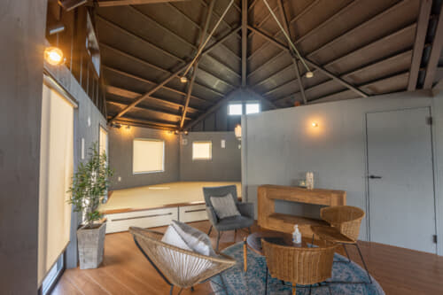 屋内はリビング・ダイニング・寝室・温泉の浴室&トイレで構成されていて、リビングとダイニングは間仕切りがないため奥行きを感じられるスペースとなっているのが特徴的。