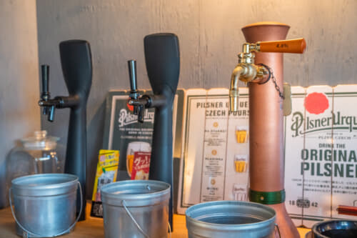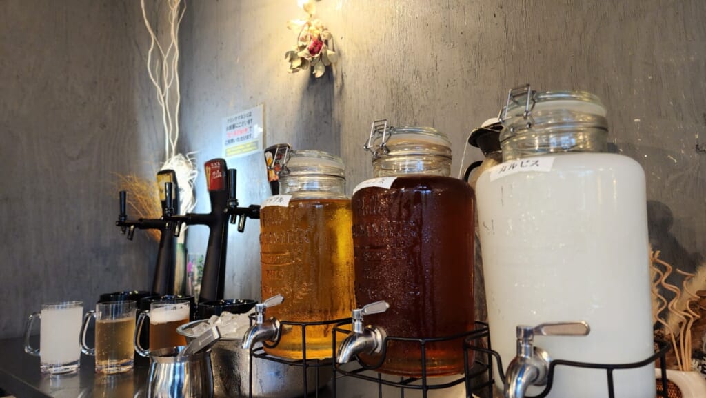 管理棟には無料のドリンクバーがあり、15時〜20時までの間日替わりのソフトドリンクやビールや酎ハイ・ハイボールなどのアルコールが飲み放題。