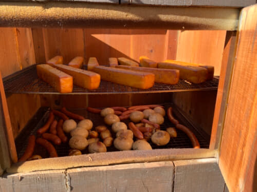 管理棟に設置してある燻製器を使っての燻製作り体験ができる、くんせいマルシェ。