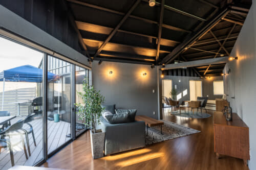 屋外デッキと屋内を隔てるテラス窓は広く開けても気持ちよく、また暑い夏や寒い冬には室内エアコンで快適に過ごすことができます。