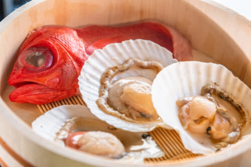 まずはさっぱりとアルミホイルに乗せた金目鯛と殻付きのホタテをグリル。