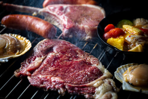子供用にはオプションから「キッズBBQ」のセットを追加注文することができますが、今回はお肉屋さんとスーパーで買ってきたウィンナーやお惣菜も少し足しつつ、大人用のステーキをシェアして食べました。