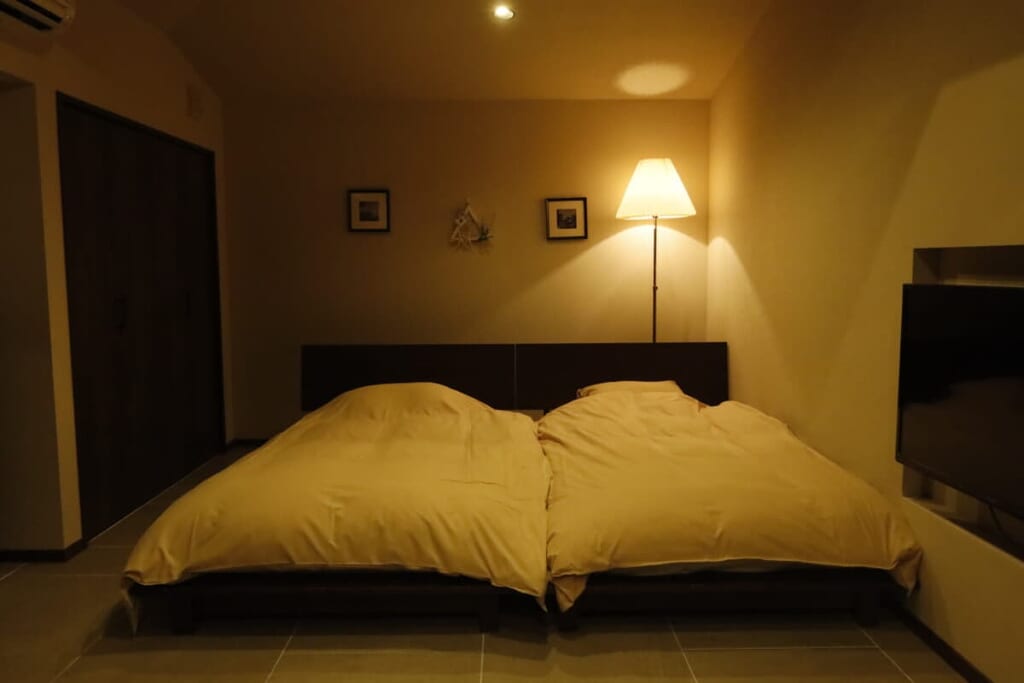 4棟のヴィラの大きさは同じで、2ベッド(セミダブルベッド×2)か4ベッド(シングルベッド×2)の違いがあり、定員は2〜5名です(5名を超える場合は1名追加料金6,600円 / 名)。