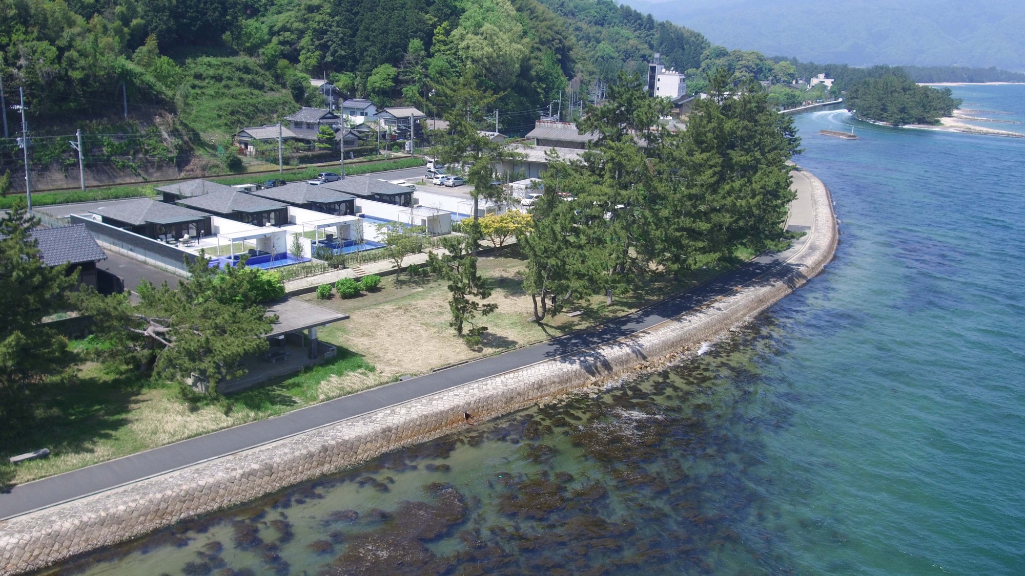 海沿いに位置する施設の後ろ側は京都丹後鉄道の線路と山になっていて、上り下りそれぞれ1時間に1本程度電車が走る音が聞こえますが、あとはとても静かで落ち着いた雰囲気の場所です。