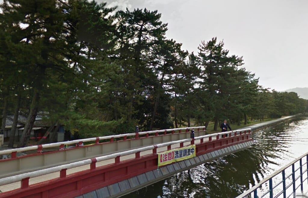 船が通る時だけ橋桁が90度自動で回転するというとても珍しい橋で、赤い鮮やかな色も松の林とのコントラストが美しいフォトスポットです。