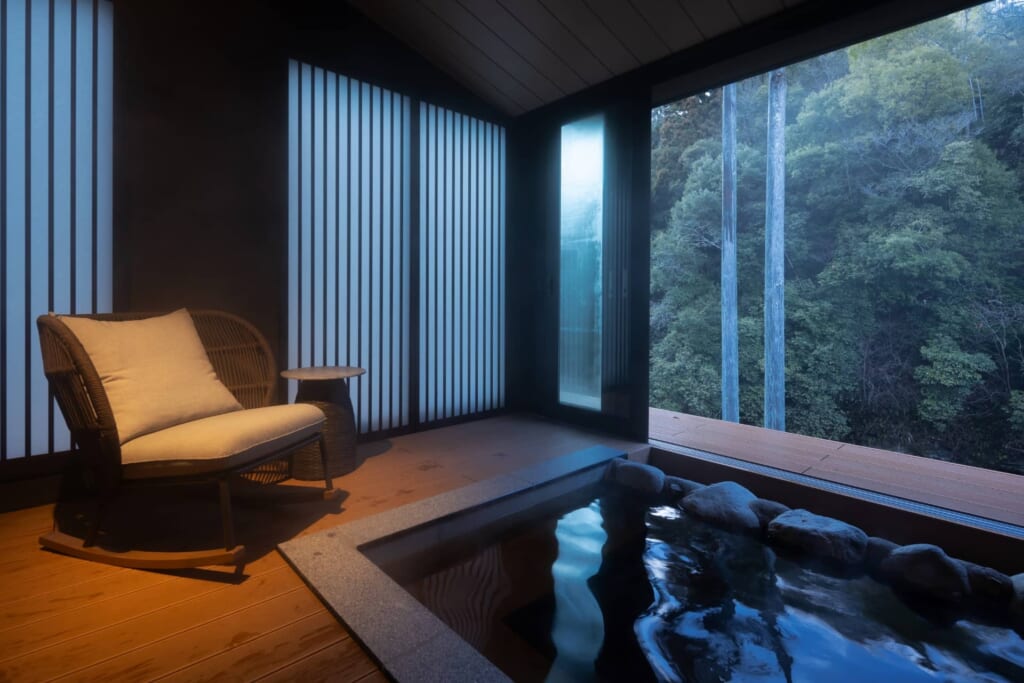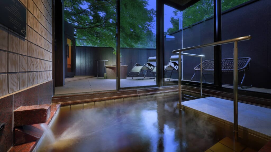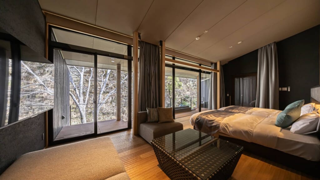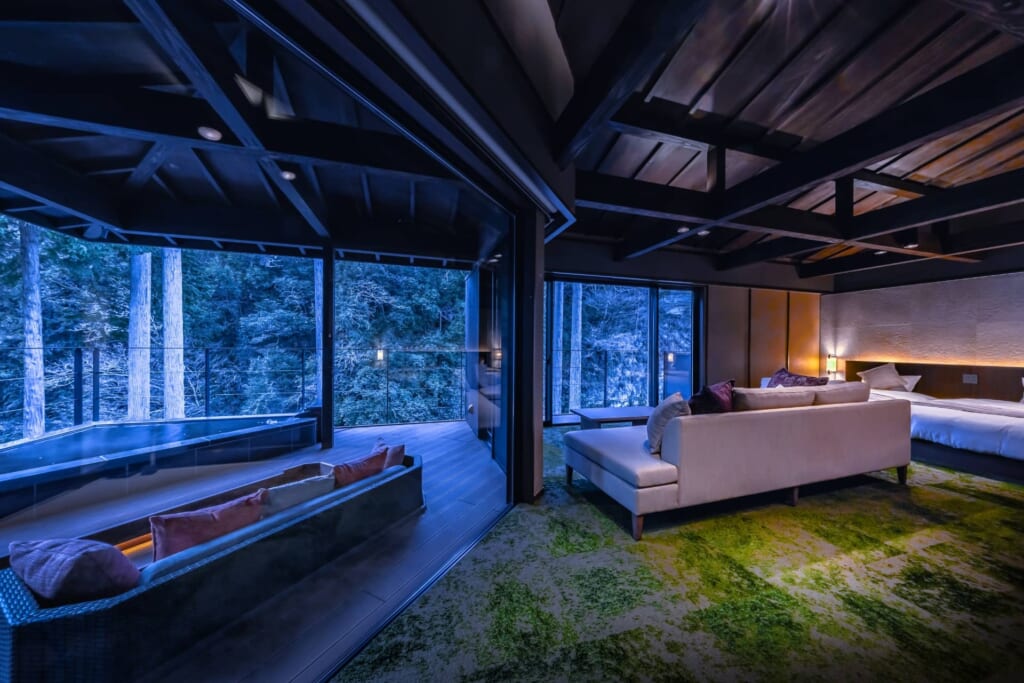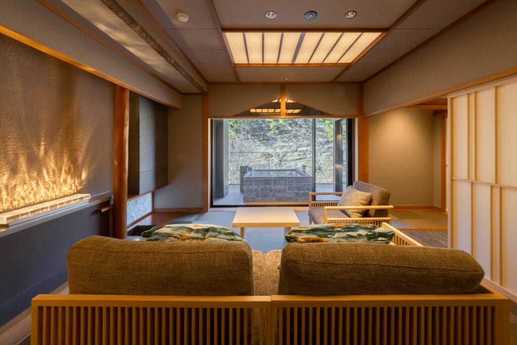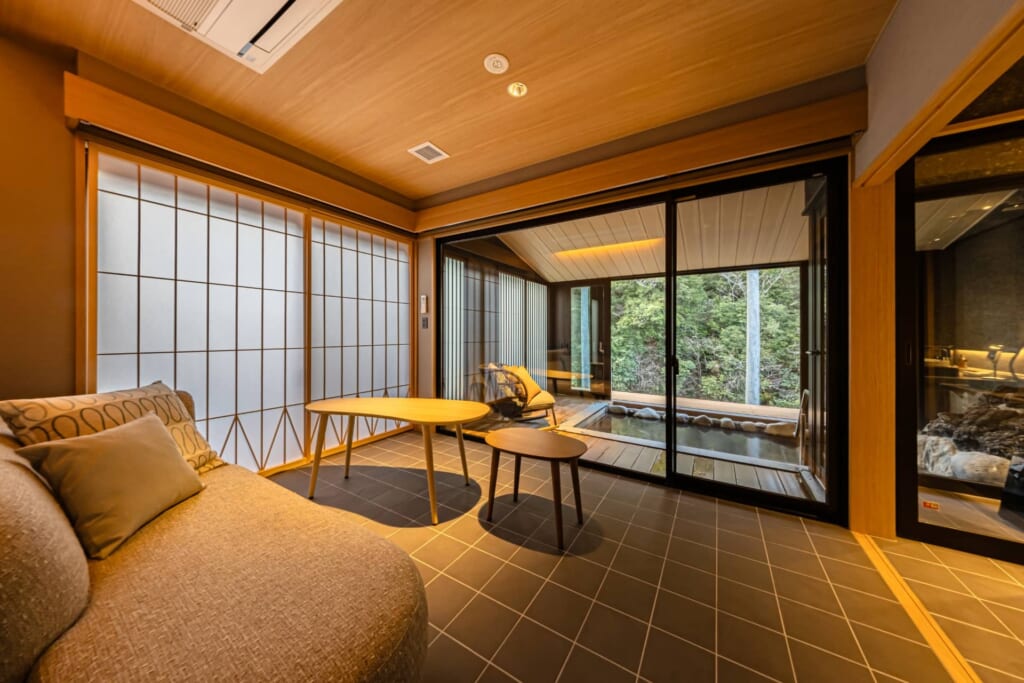 新館リバーサイドヴィラの湯治デザインルームは、元々温泉旅館の大浴場だったスペースを客室にリノベーションしたヴィラタイプの宿泊棟。