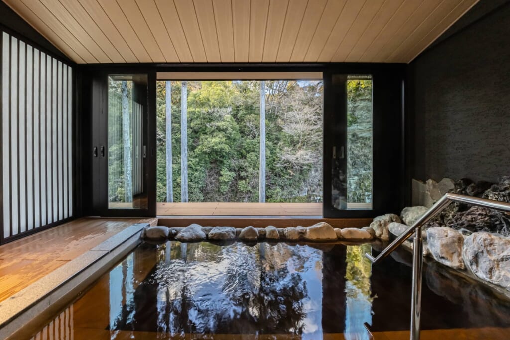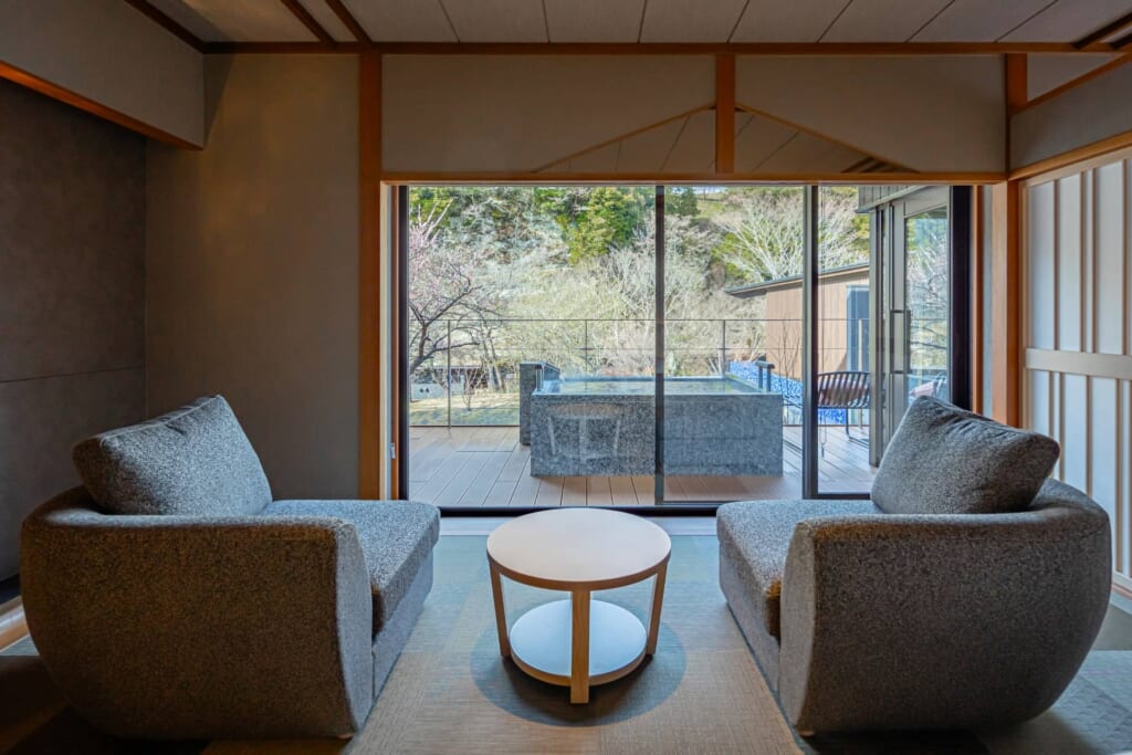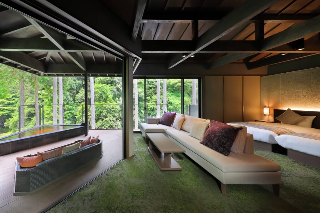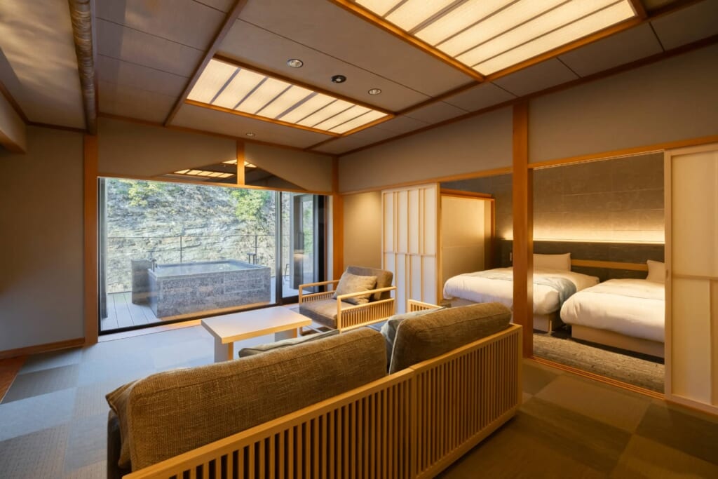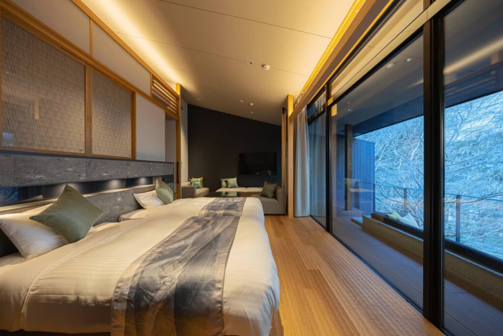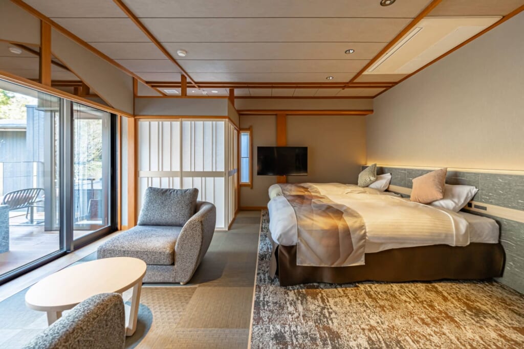 新館リバーサイドヴィラの湯治デザインルームは、元々温泉旅館の大浴場だったスペースを客室にリノベーションしたヴィラタイプの宿泊棟。