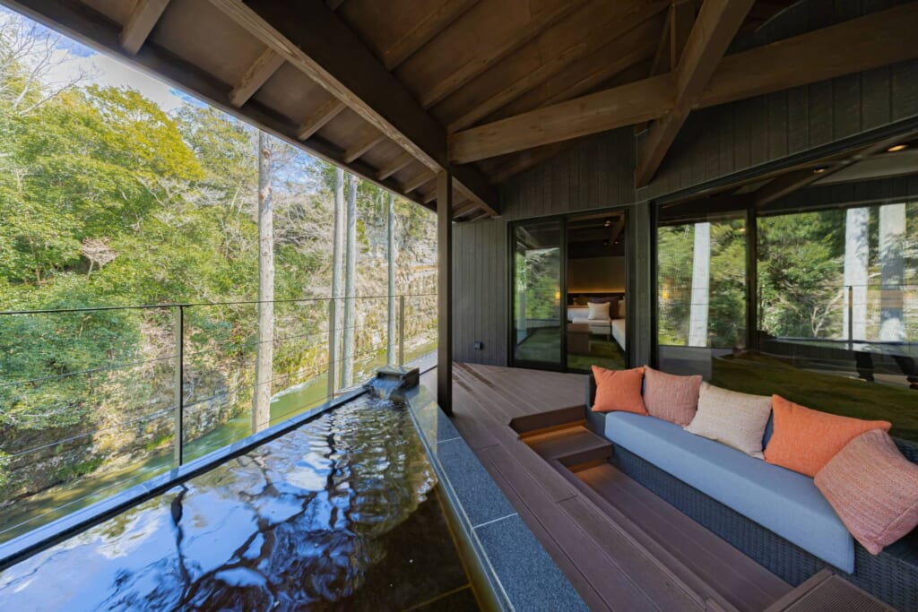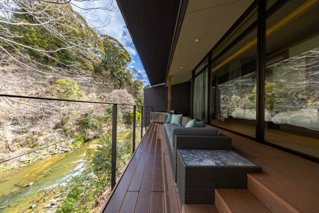 ラグジュアリーな居住空間と、養老川に向かって大きくせり出した開放的なテラス&露天風呂が特徴のリバースケープルーム