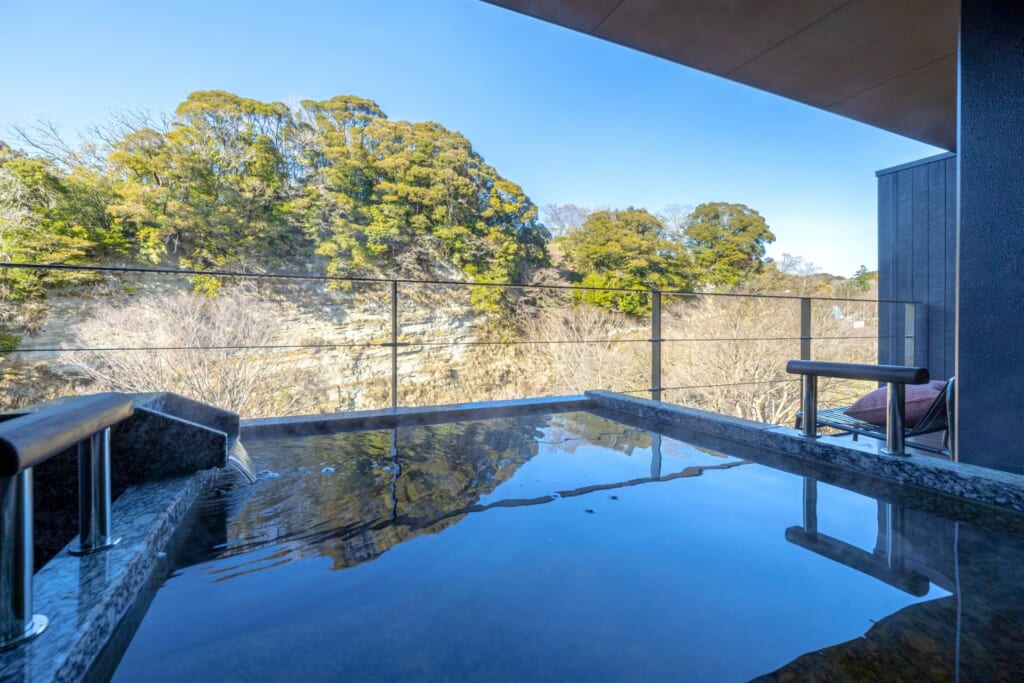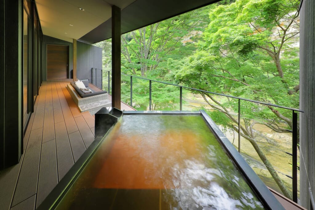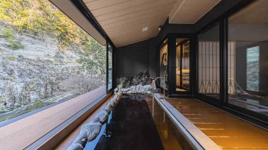 全室に黒湯温泉の露天風呂を備えたラグジュアリー仕様で、山側の本館では養老渓谷が作り出した断崖絶壁の自然美・懸崖境(けんがいきょう)を、川側の新館では目の前を流れる養老川の流れを、プライベート空間で入浴しながら堪能できるのが特徴。