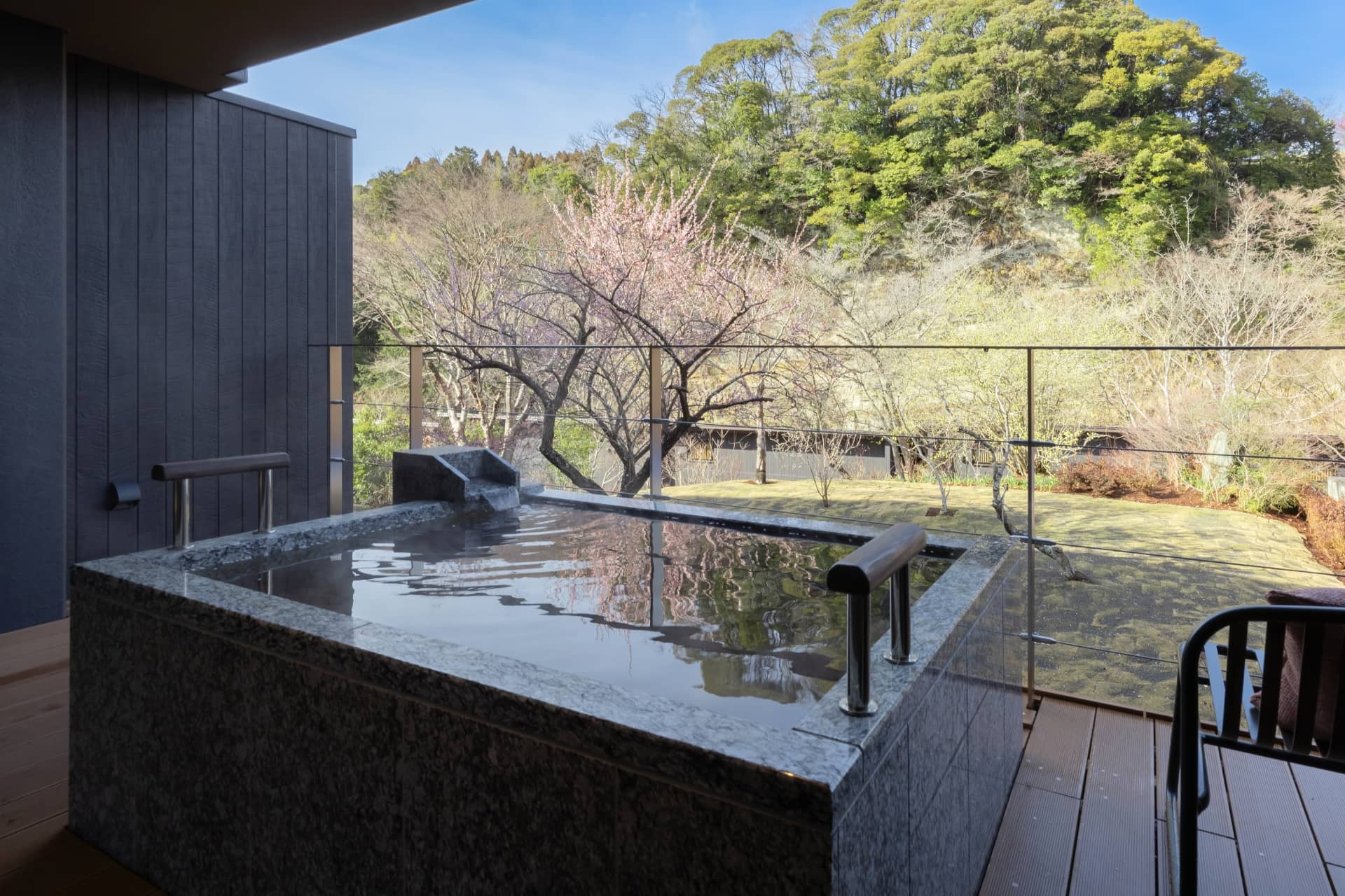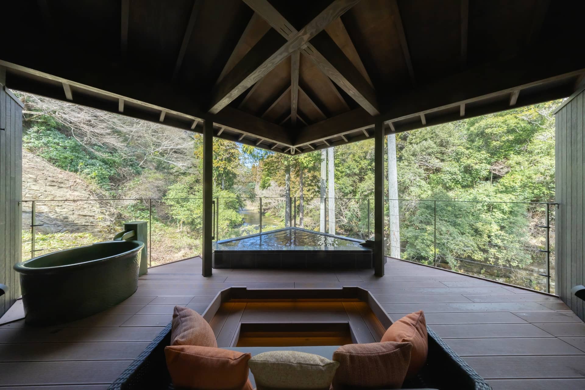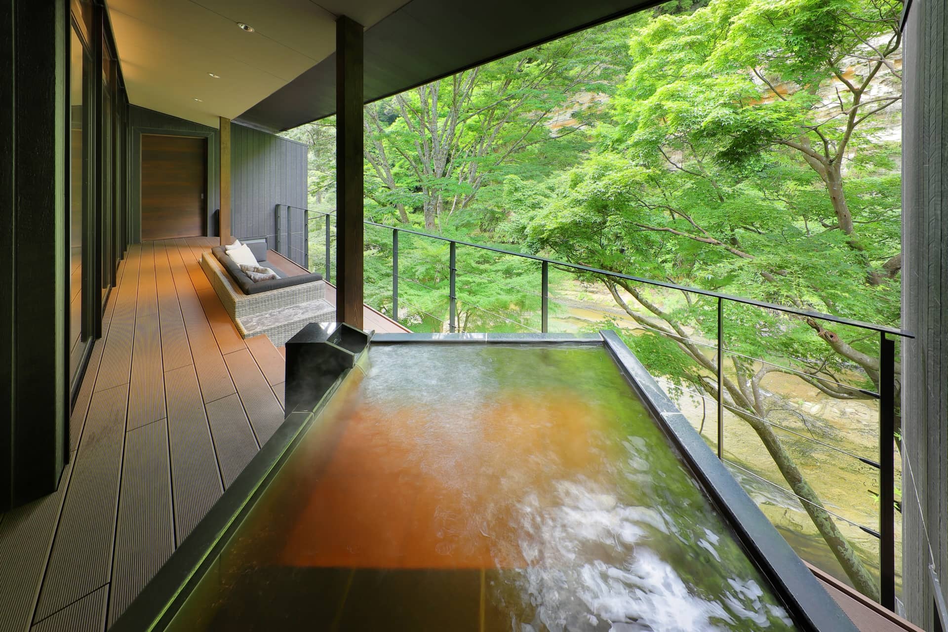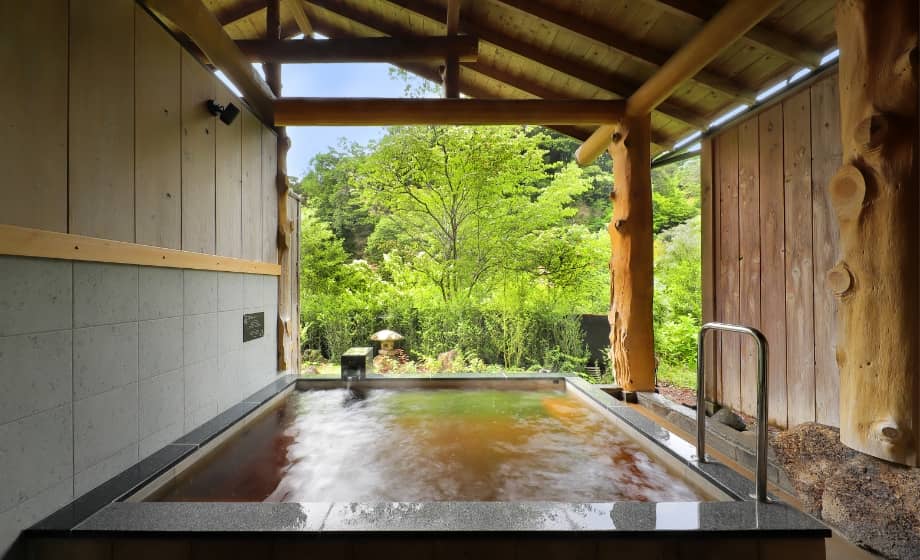 テラスは視界を遮る手すりや柵などが最小限に抑えられていて、目の前を流れる川との一体感が感じられる上、露天風呂部分にも屋根がついているので雨の日でも安心。