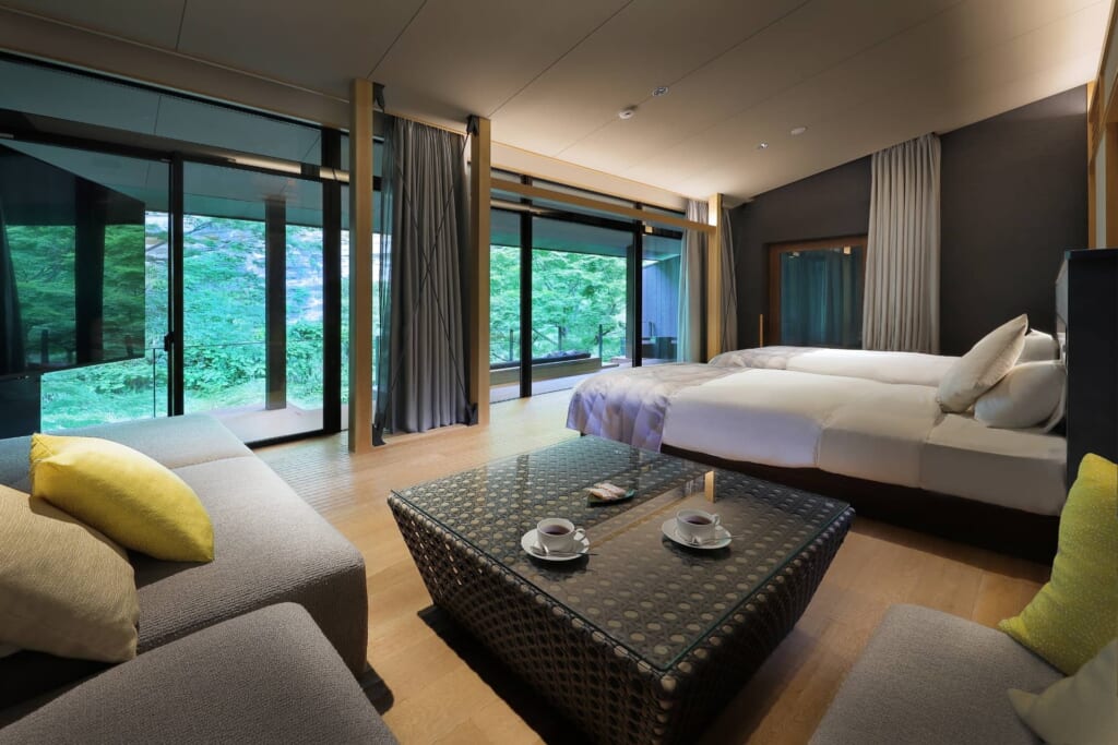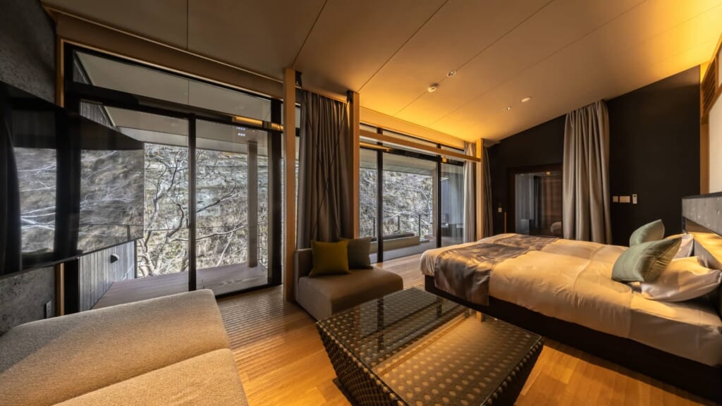 懸崖境と養老川をパノラマで望むことができ、「自然と完全に一体となる滞在」をコンセプトに設計された最上級のスイートタイプゲストルーム・リバーパノラマルーム