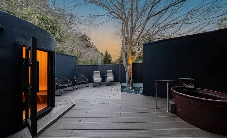 客室内のプライベートサウナで汗をかいたら、サウナ横の水風呂に入り屋外テラスのソファで外気浴して整って、さらに露天の温泉でリラックスと、自然の中での極上SPA体験ができるお部屋です。