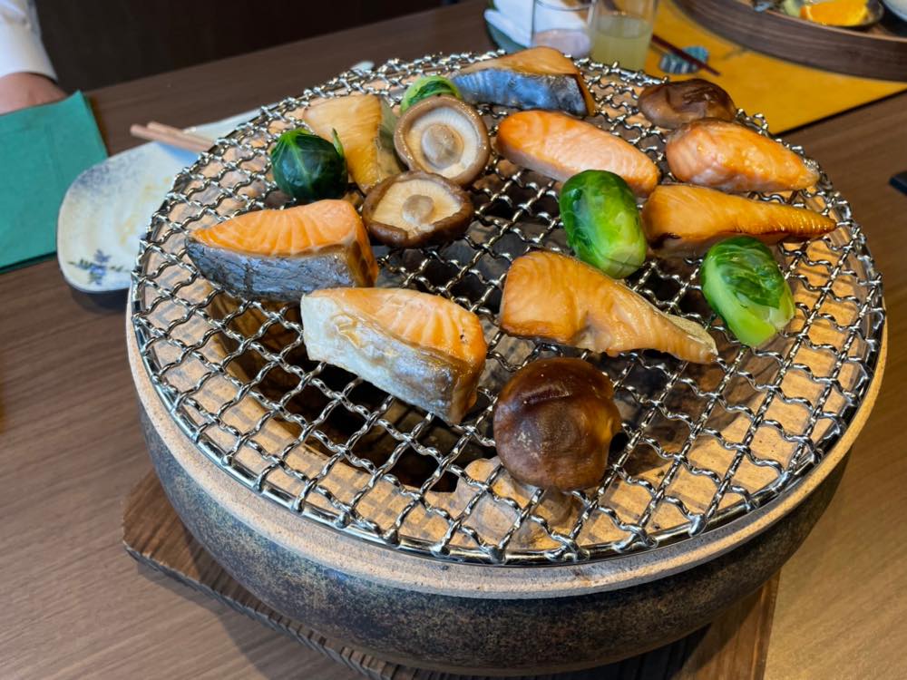 そしてテーブルには七輪が置かれ、干物や野菜をグリルして熱々を頂くスタイル。