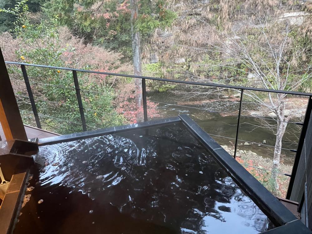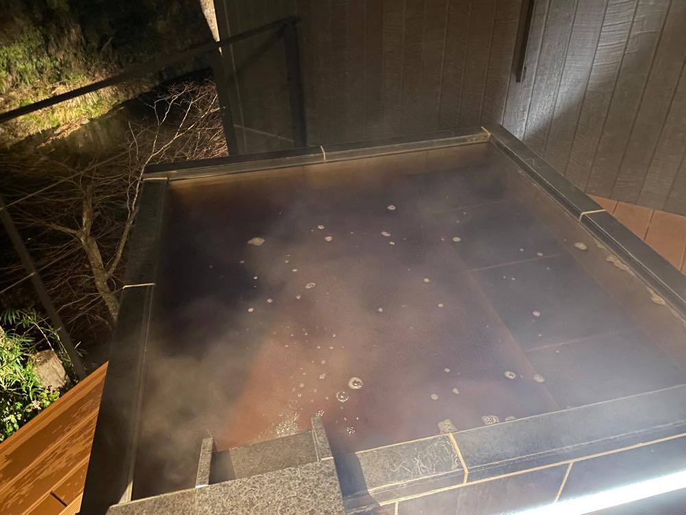 お部屋の露天風呂ももちろん黒湯の温泉で、とろみのあるお湯は冷たい外気に触れても肌を包み込んで温めてくれます。