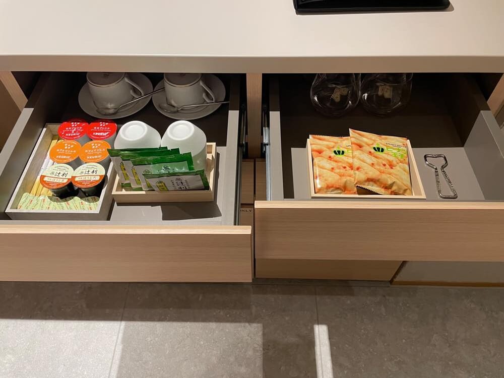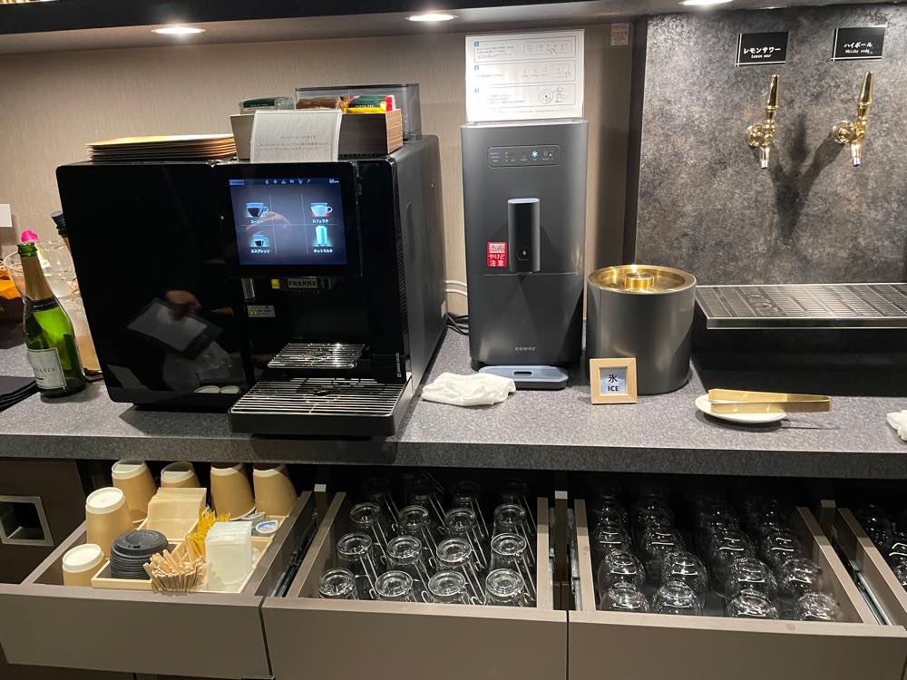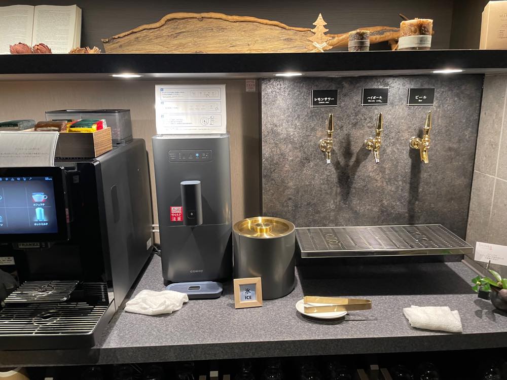 フロント横には、ビールやハイボールなど無料のウェルカムドリンクやおつまみ・軽食が自由に頂けるラウンジコーナーが設けてあります。
