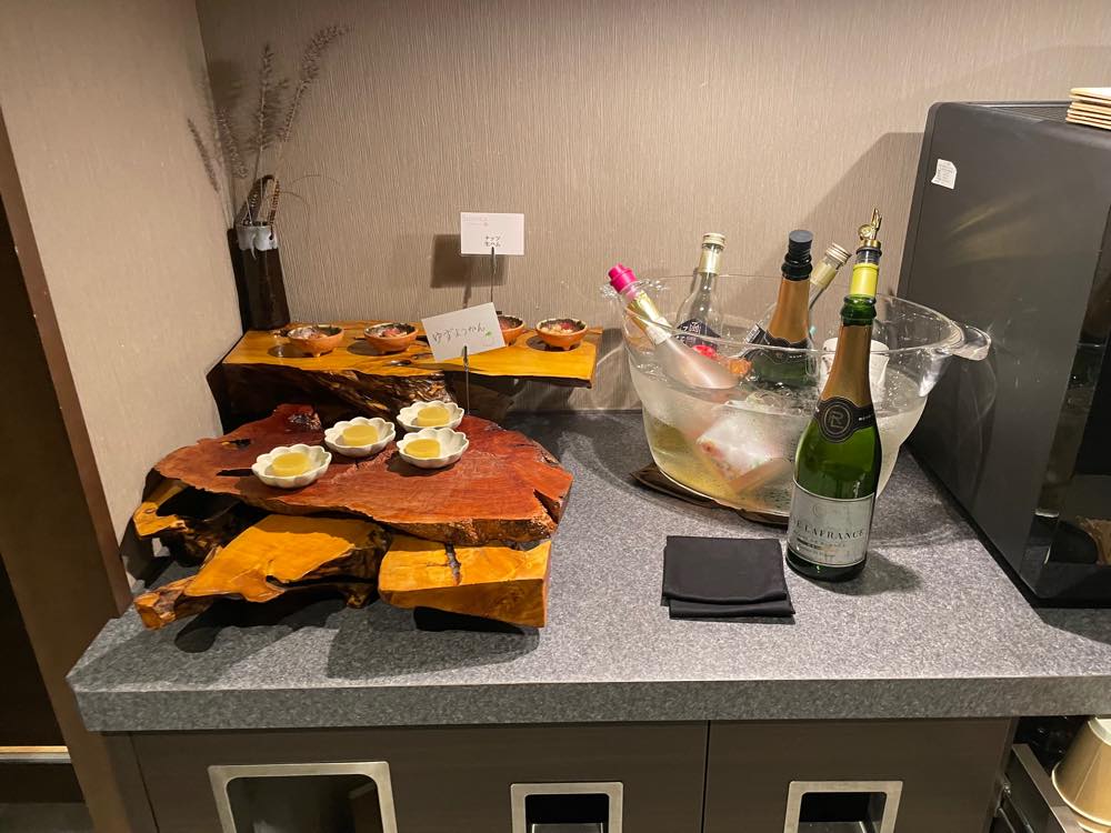 交代で露天風呂を堪能する間に本館のラウンジにおつまみと飲み物を取りに行き、お風呂上がりの晩酌タイム。