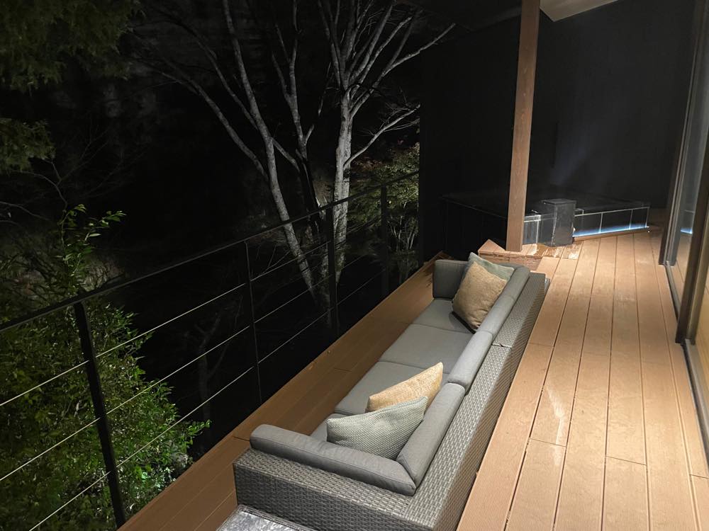全室露天風呂とアウトドアチェアやソファを配したアウトドアデッキがある他、室内にシャワーブース備えた仕様となっています。