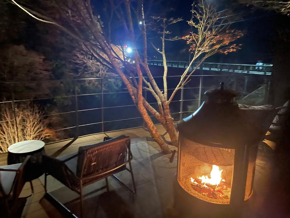 ラウンジ近くの屋外デッキには焚き火が灯され、日が暮れると夜の渓谷を眺めながらウェルカムドリンクを楽しむ人の姿もちらほら。