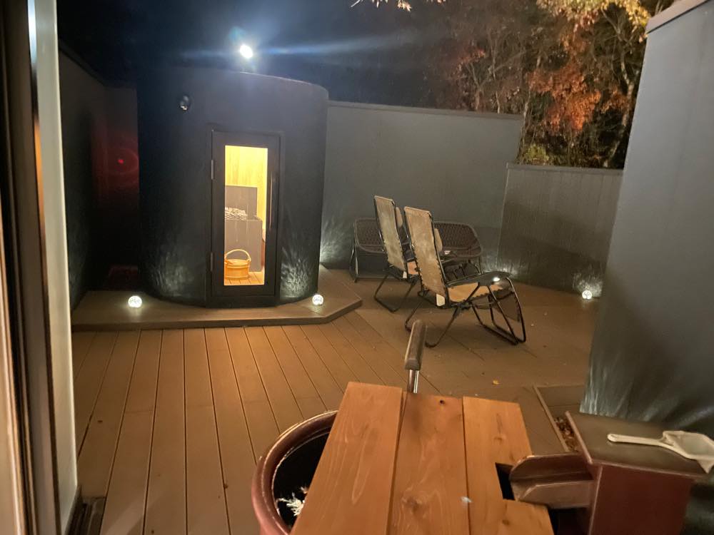客室サウナと水風呂も完備で室内面積は69m²(テラスを含む)、セミダブルベッド2台設置してあって最大定員は2名の贅沢空間です。